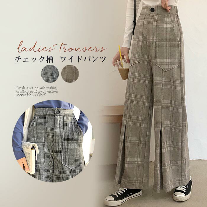 レディース グレンチェック ワイドパンツ フレアパンツ ロングパンツ ガウチョパンツ パラッツォパンツ