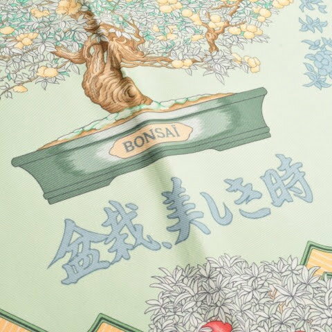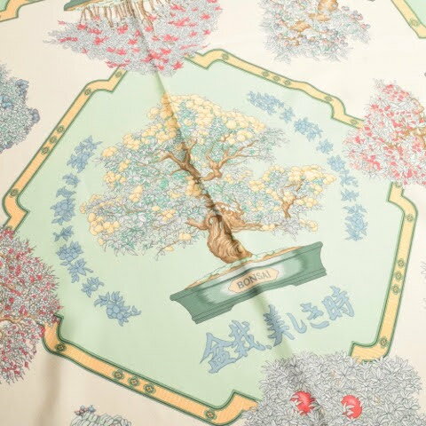 HERMES / エルメススカーフ カレ 90 シルク BONSAI 盆栽、美しき時 和柄 ショール 大判 レディース グリーン ベージュ 緑 若干使用感はございますが、ダメージの少ない状態です。