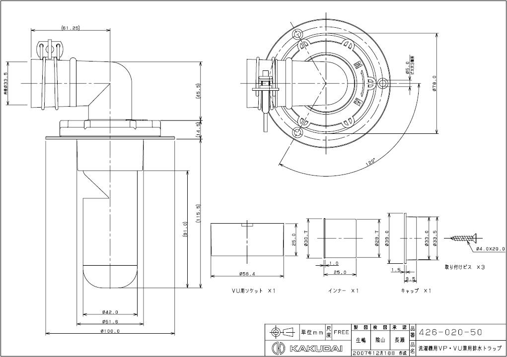 呼び50ミリ塩ビ管用、洗濯機排水トラップ(VP・VU兼用、ステンレス製つば)