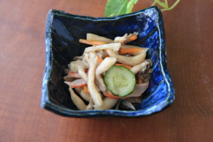 濃い青でジーパンの色に似ており、盛り付けた食材を引き立ててくれます。